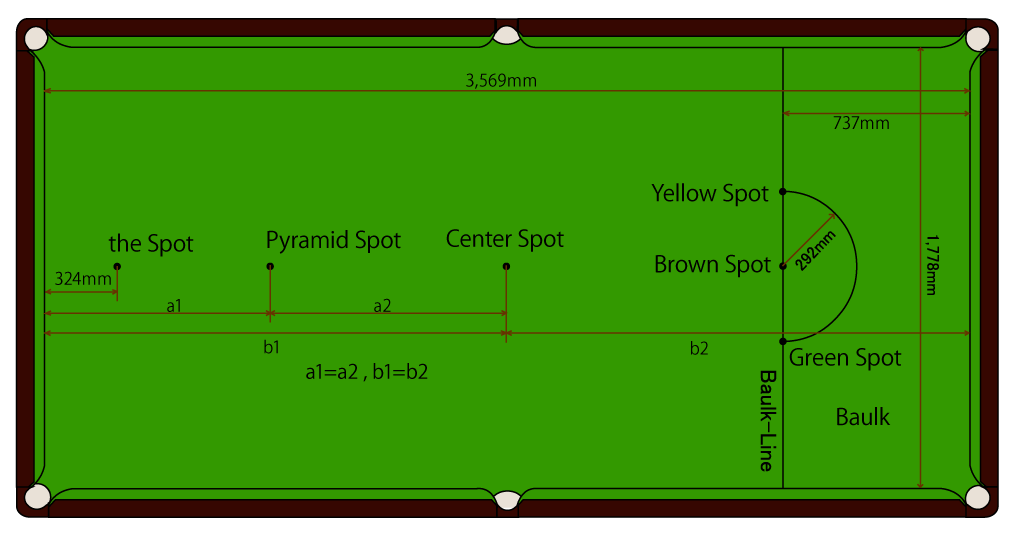 クッション間内の 競技エリアは3,569mm × 1,778mmとする(フィート表示の場合11ft 8.5in×5ft 10.0in)。