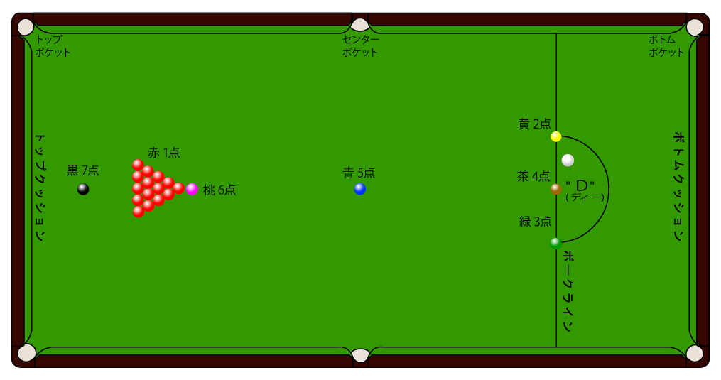 テーブルの短い方の2辺はそれぞれボトムクッション(ボークとも呼ばれる)とトップクッションと呼ぶ。